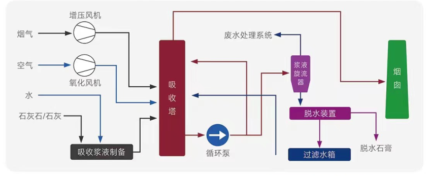 煙氣經增壓風機進入吸收塔( 吸收塔底部為漿池),與來自循環泵送入的漿液接觸并被除去SO.。新鮮的漿液不斷地加入到吸收塔底部的漿池中。被洗滌后的煙氣經塔內除霧器除霧后進入煙肉外排。空氣經氧化風機送入吸收塔底部的漿液中,將CaSO,強 制氧化成CaSO..通過循環泵將漿液送入獎液旋流器,分離出獎液中的水送入廢水處理系統漿液旋流器的底流進入脫水裝置,經脫水后即為脫水石膏。脫水裝置脫出的水,經過濾后送入吸收塔回用。